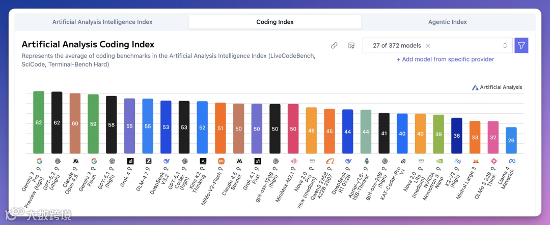 Coding Index(编程能力)榜中,谷歌Gemini 3 Pro与OpenAIGPT-5.2并列第一(62分);Claude Opus 4.5以60分位列第三。国产方面,GLM-4.7(55分)、DeepSeek V3.2(53分)、Kimi K2 Thinking(52分)、MiMo-V2-Flash(51分)。