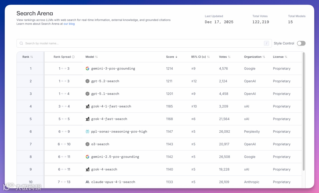 Search Arena评估联网搜索能力,截至12月17日累计投票12万。