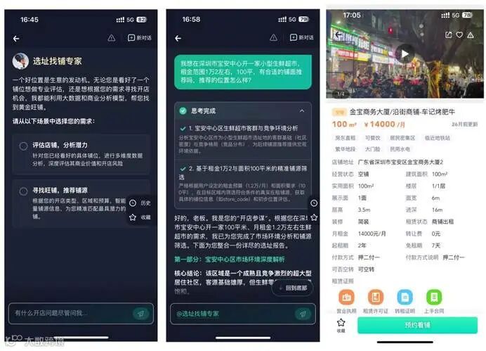 用户只需设定业态类型、预算范围及预期客单价,系统即可基于全国3000多万商铺数据,从人流量、客群画像、竞品分布等维度进行智能分析,提供客观选址建议,并支持实时免费咨询,相当于配备专属经营顾问。