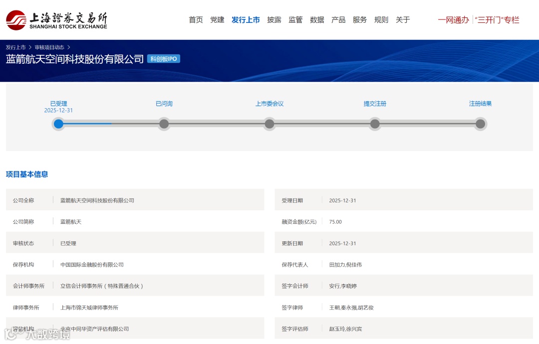 12月31日,上交所官网信息显示,蓝箭航天空间科技股份有限公司(简称“蓝箭航天”)科创板IPO申请获受理,正式冲刺科创板“商业火箭第一股”。根据招股书申报稿,蓝箭航天拟融资金额75亿元,目前仍处于亏损状态,拟采用科创板第五套标准上市。这意味着科创板第五套上市标准正式扩大至商业航天领域。此前,采用科创板第五套标准上市的企业均为生物医药和生物器械公司。