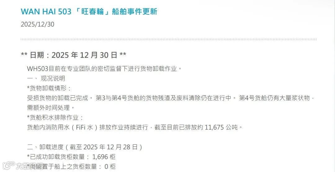 据最新获悉:昨天(12月30日),万海航运发布WAN HAI 503轮火灾事故的最新进展。