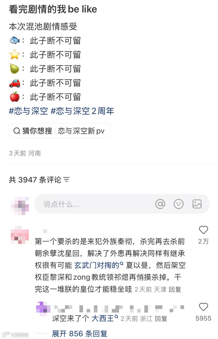 这样宏大的主题,不是《恋与深空》第一次写了。可以说,这也是一次“回归”,回到游戏最擅长也最具辨识度的叙事。权力中的斡旋、“相爱相杀”的关系张力,都为玩家提供了广阔的讨论空间。早在PV预热阶段,玩家便围绕男主身份展开讨论。从“此子断不可留”,到讨论如何制衡权力,都成为游戏内容的一部分。爱是游戏的主题,但权力故事本身则提供了更多可能性。