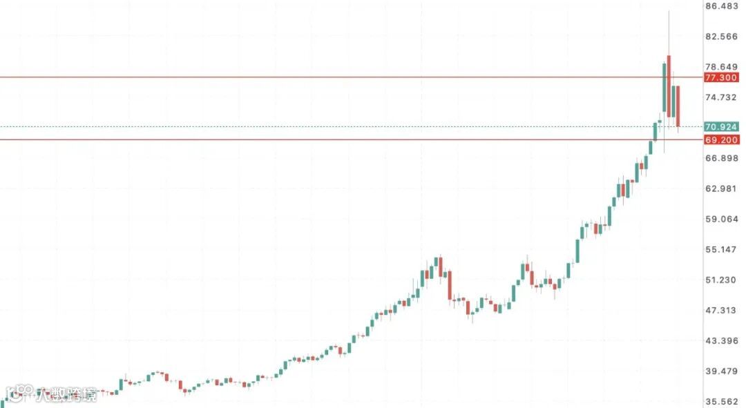 在经历史诗级的爆涨之后,现货白银周一早盘经历过山车行情,在大涨6%逼近84美元/盎司后直线走低,目前跌超5%至70.50美元/盎司。行情剧烈波动之际,社交平台上流传的一则关于"系统重要性银行"因白银期货空头头寸爆仓的传闻引发市场广泛关注。