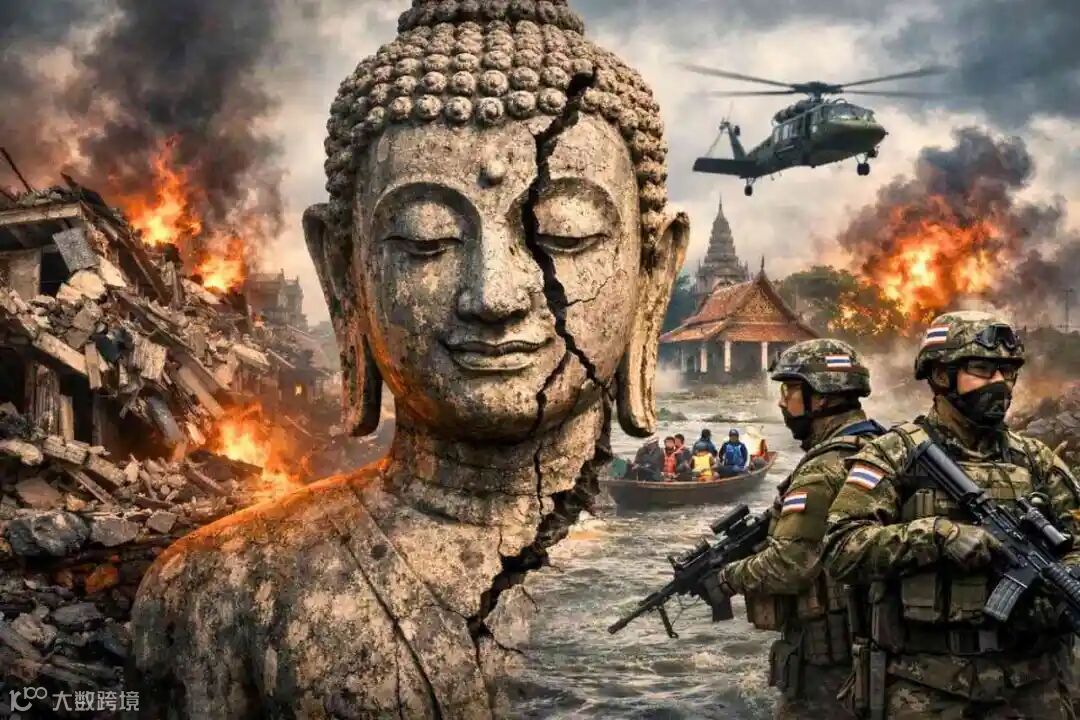 佛像在燃烧的建筑、洪水和泰国士兵前出现裂痕,象征着2025年多重危机冲击泰国。