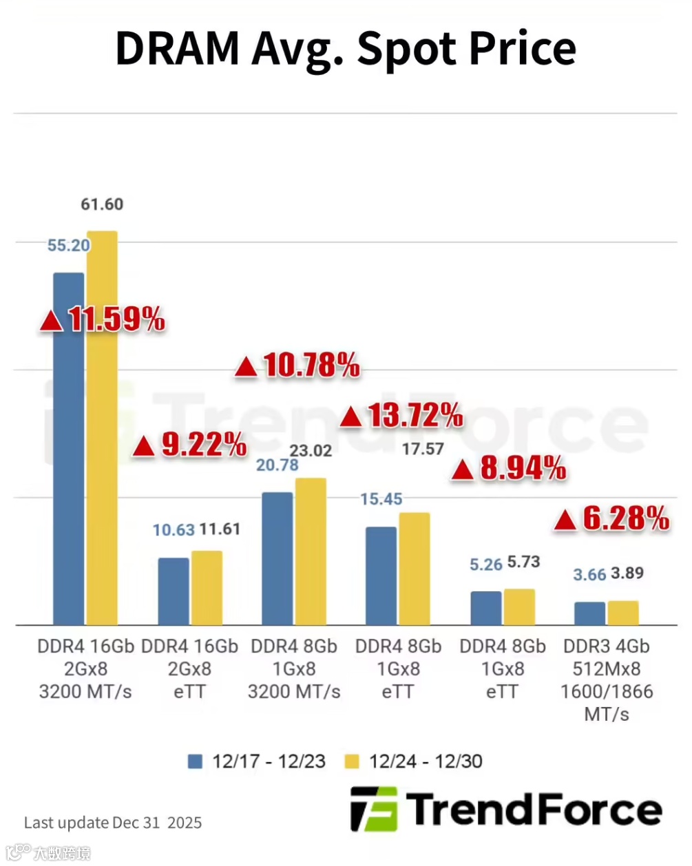 价格走势已获数据验证:主流型号DDR4 1Gx8 3200MT/s芯片现货均价,由12月24日当周的22.235美元上涨6.80%,至12月30日当周的23.746美元 [3] 。