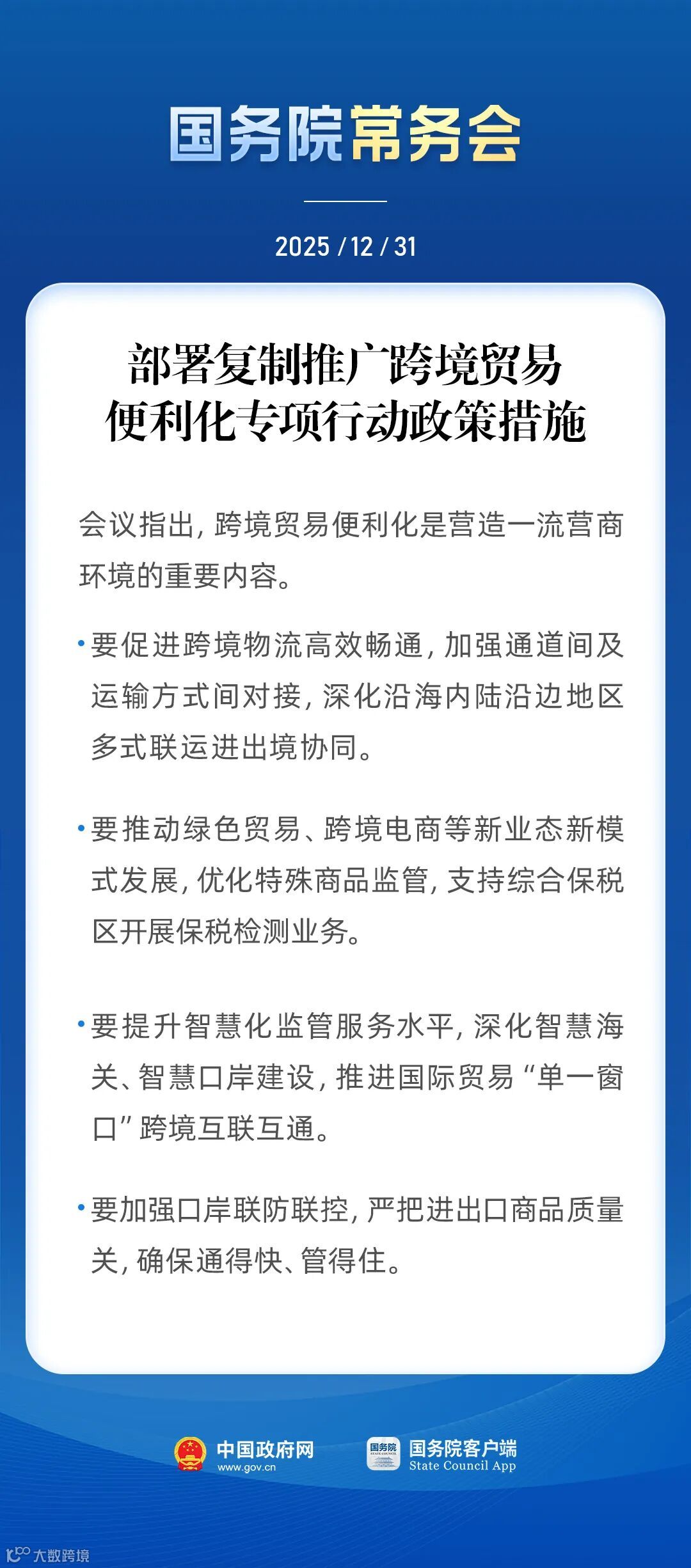 国务院常务会议部署复制推广跨境贸易便利化专项行动政策措施,旨在优化营商环境、激发外贸内生动力,并精准对接2026年进口跨境电商发展新趋势。在消费升级深化、数字技术全面赋能、全球供应链加速重构背景下,该政策将系统性打通堵点、拓展空间,推动行业实现规模与质量双提升。