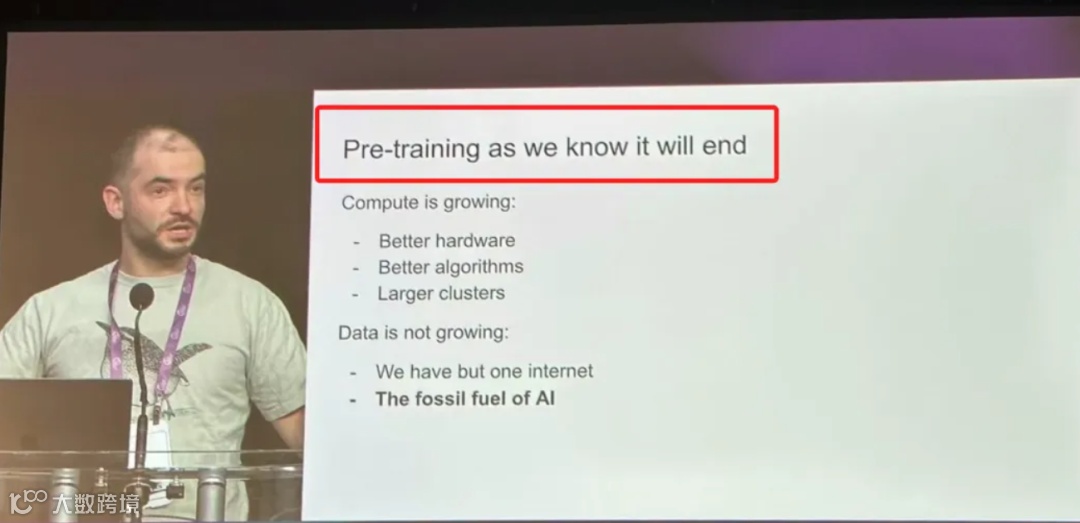 但自2025年起,质疑声渐起。Ilya在NeurIPS大会上宣布:“我们所熟知的预训练即将终结。”他将数据比作AI的“化石燃料”,指出全球高质量数据正趋枯竭,预训练增长终将放缓。