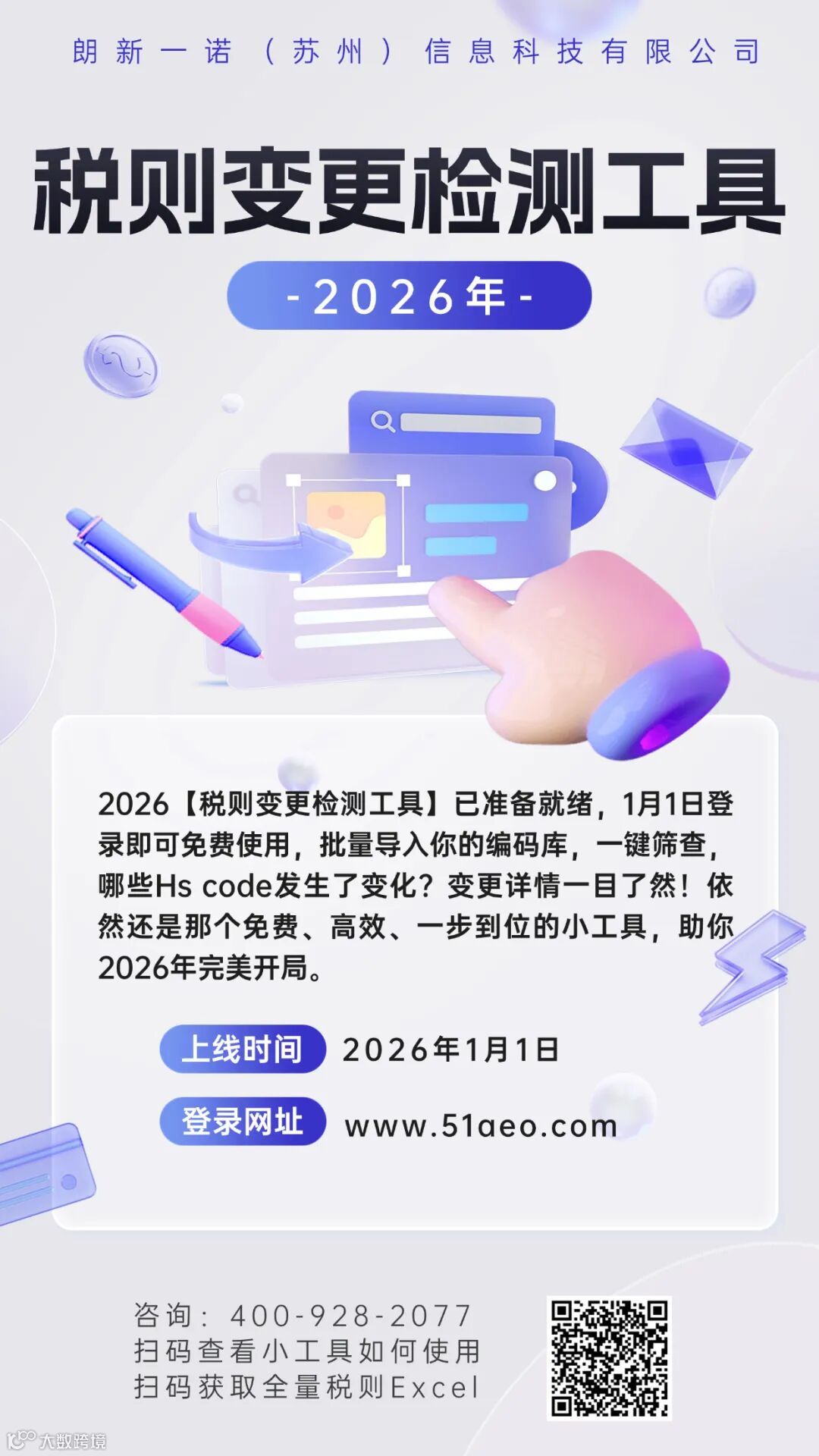 为助力企业高效应对,【2026税则变更检测工具】已正式上线,登录www.51aeo.com即可免费使用。导入企业物料编码库,系统自动识别HS编码变动情况,并提供详尽的税则变更明细,支持一键导出,大幅提升新一年关务工作响应效率。