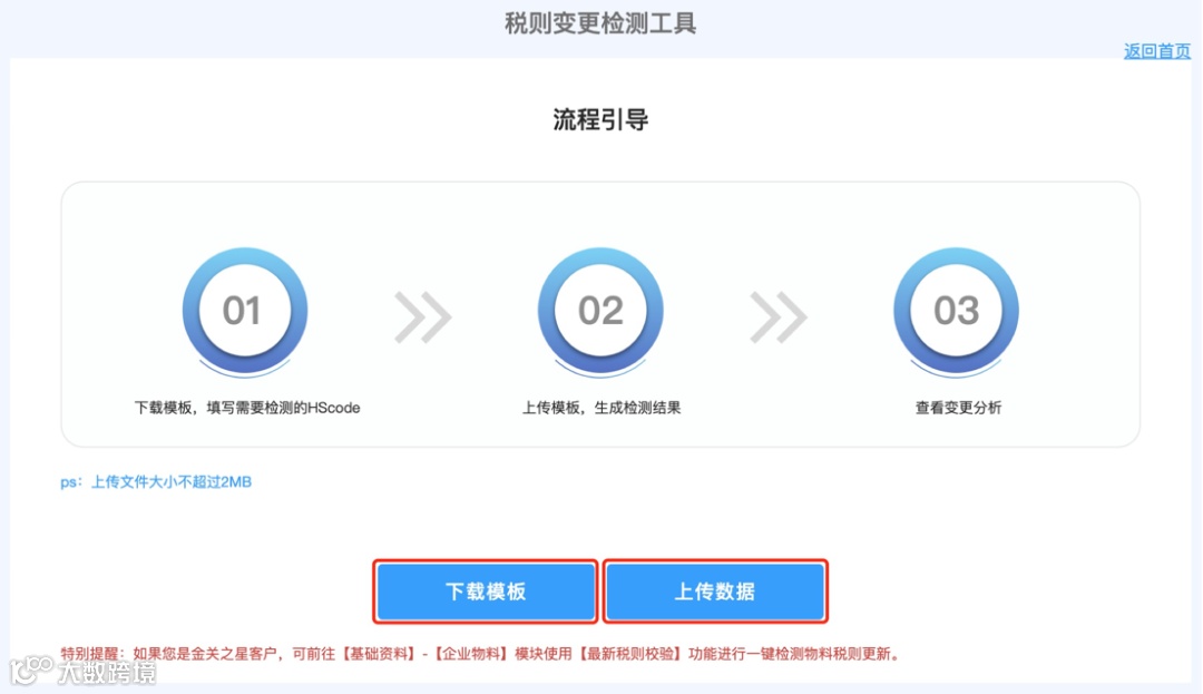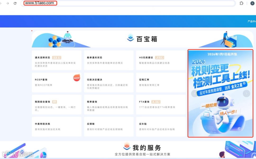 登录www.51aeo.com,点击右侧海报进入工具界面;下载模板,填写待检测HS编码后上传,系统即时生成变更分析报告。