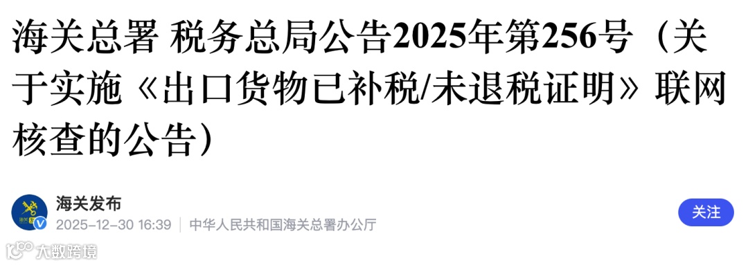 2025年12月25日,海关总署与税务总局联合发布2025年第256号公告,明确自2026年1月1日起,对《出口货物已补税/未退税证明》实施电子数据联网核查。此举旨在优化口岸营商环境,提升跨境贸易便利化水平。