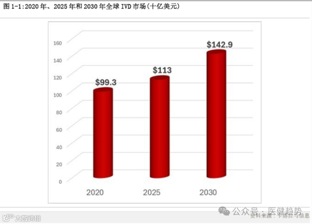 《体外诊断的全球市场》第18版报告全面覆盖全球IVD市场现状、发展趋势、竞争格局及细分领域预测 [2] 。 2025年全球IVD市场规模达1130亿美元,预计将以5%的复合年增长率(CAGR)持续扩张,至2030年突破1400亿美元 [3] 。