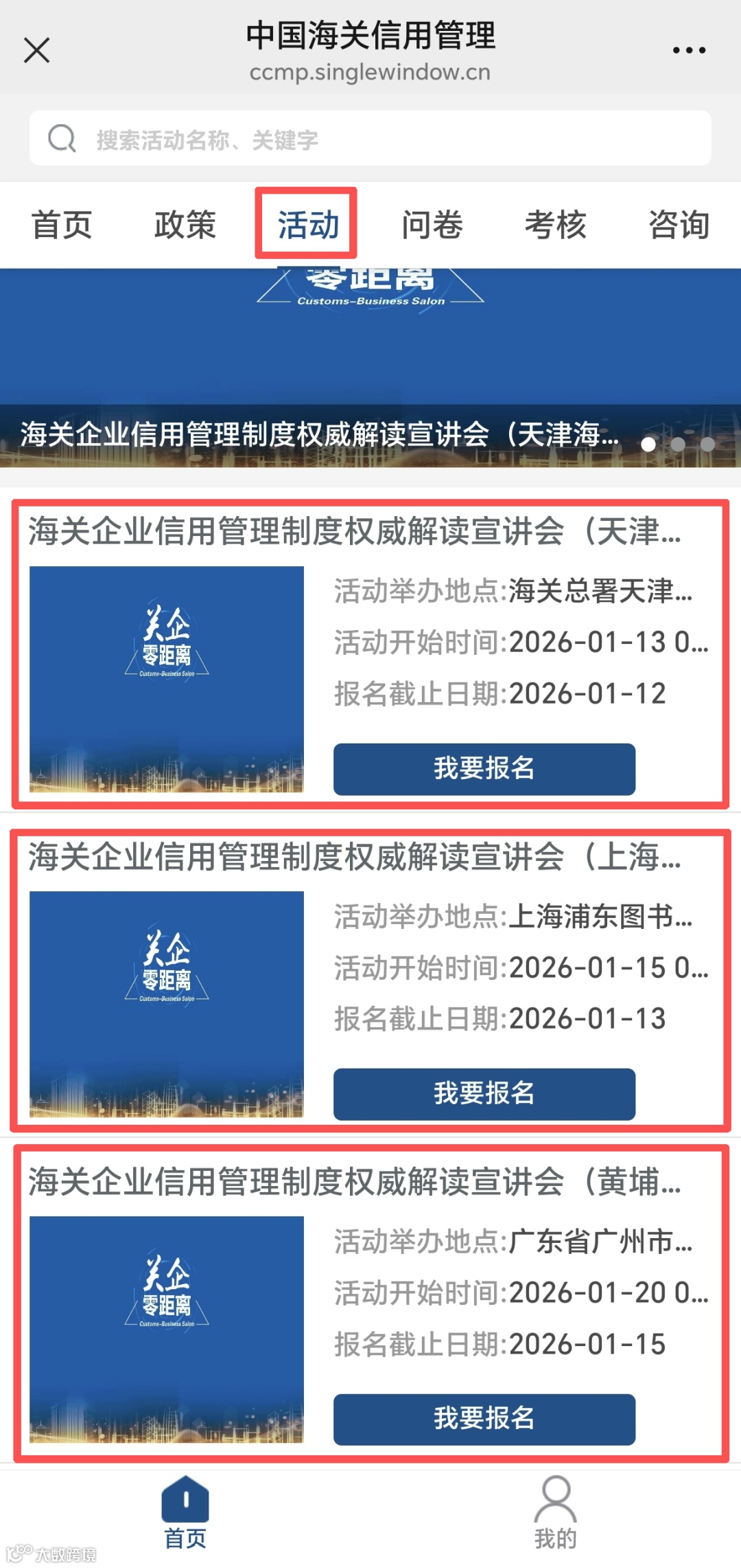 新修订的《中华人民共和国海关注册登记和备案企业信用管理办法》(以下简称《办法》)将于近日发布。为确保政策红利直达快享,帮助企业全面、及时、精准把握《办法》核心要义与实操要点,海关总署将举办“关企零距离”政策宣讲活动,于2026年1月13日、15日、20日分别在天津、上海、广州举办专场宣贯会。