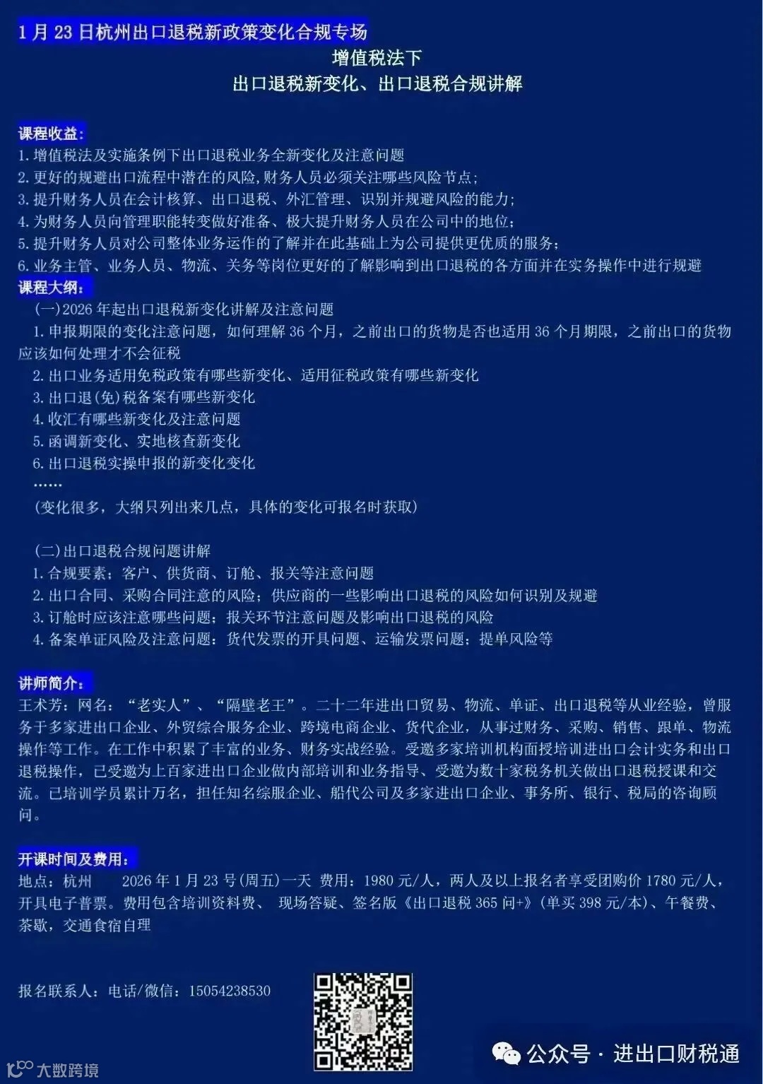 1980元/人,两人及以上者1780元/人。交通食宿自理,学费含午餐费、教材资料、现场答疑、一本398元签名版《出口退税365问》;听课座次以付款时间顺序安排;开具增值税电子普通发票;不接受现场缴费。