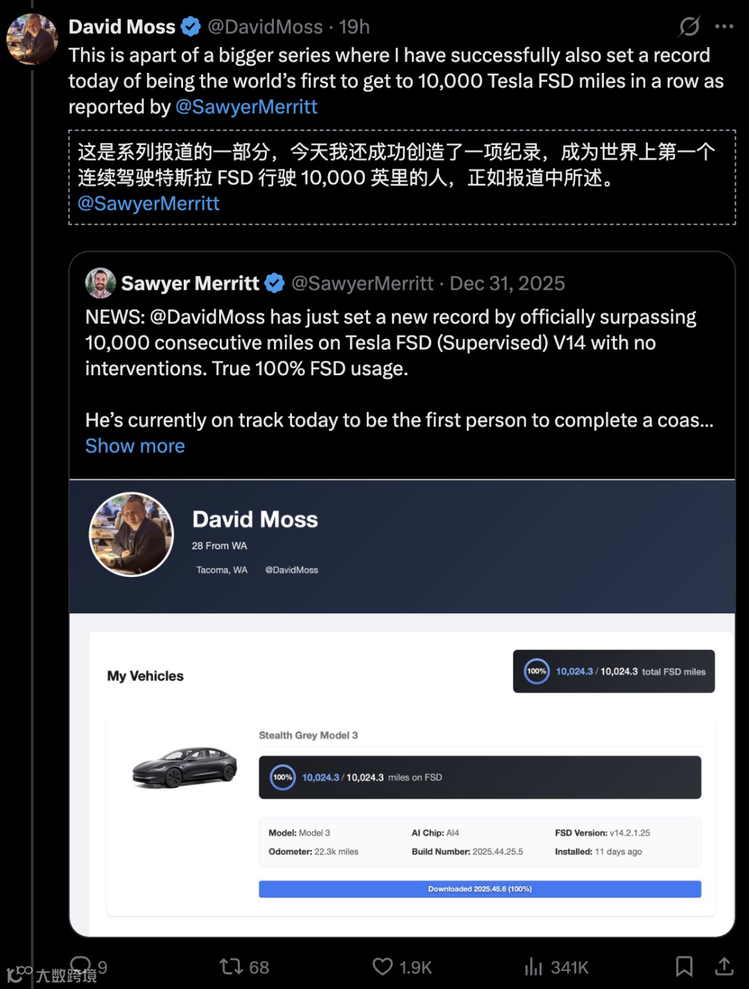 该行程涵盖加州高速公路、德克萨斯暴雨路况、东部复杂城市道路及夜间驾驶,并完成全部自动化充电操作,系统全程无险情 [2] 。Moss表示,所有数据可在FSD数据库公开验证 [3] 。