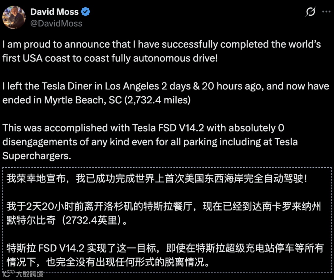 2026年1月1日,特斯拉FSD V14.2实现全球首个经第三方数据验证的「零接管」横贯美国壮举——车主David Moss驾驶Model 3从洛杉矶出发,历时2天20小时、行驶4397公里,穿越24个州,全程未触碰方向盘或踏板。