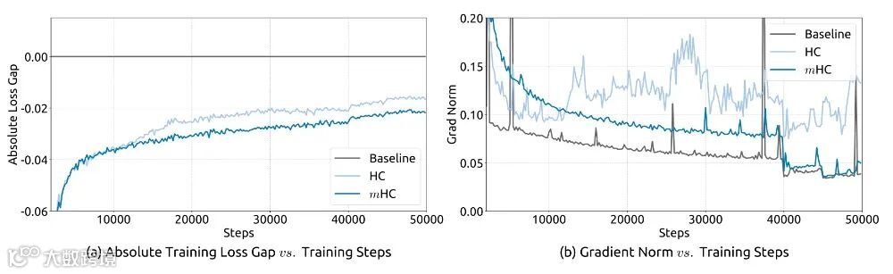 论文在27B参数规模下对比Baseline、HC与mHC三类模型。结果表明:HC训练中损失震荡发散、梯度爆炸;而mHC损失平稳收敛、梯度稳定 [8] 。分析显示,HC复合映射增益高达3000,而mHC控制在1.6,接近理想恒等映射,信号保真度高,有效抑制多层堆叠中的信号放大与梯度爆炸问题 [9] 。