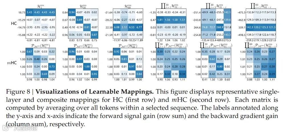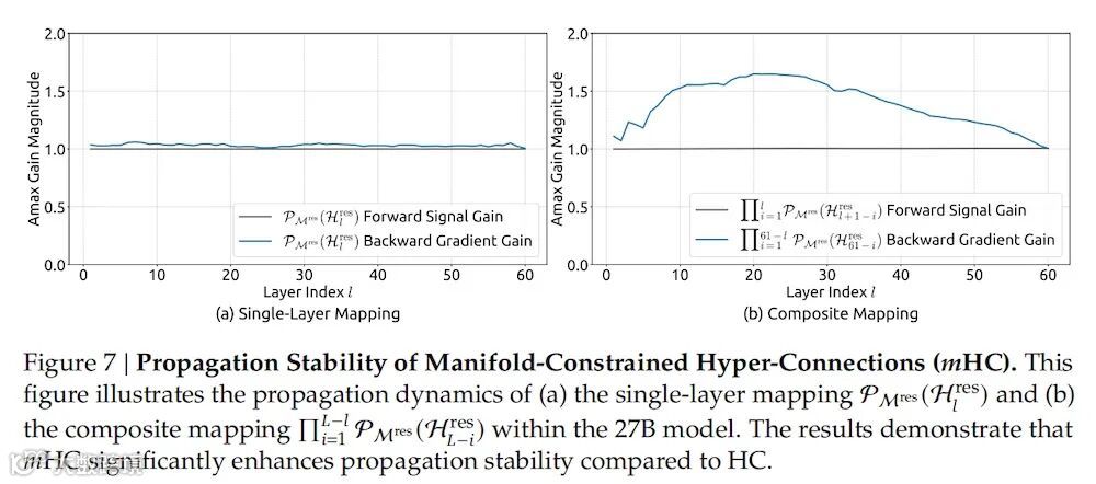 ▲mHC将残差映射投影到双随机流形后,显著提升了前向信号与反向梯度传播的稳定性。