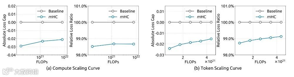 可扩展性方面,3B–27B模型验证显示,mHC性能增益随模型规模扩大而稳定甚至增强(如DROP提升从1.5→2.3),说明其对深层大模型中更高的信号保真需求具有强适配性;1T token训练下未见过拟合,泛化能力增强 [11] 。
