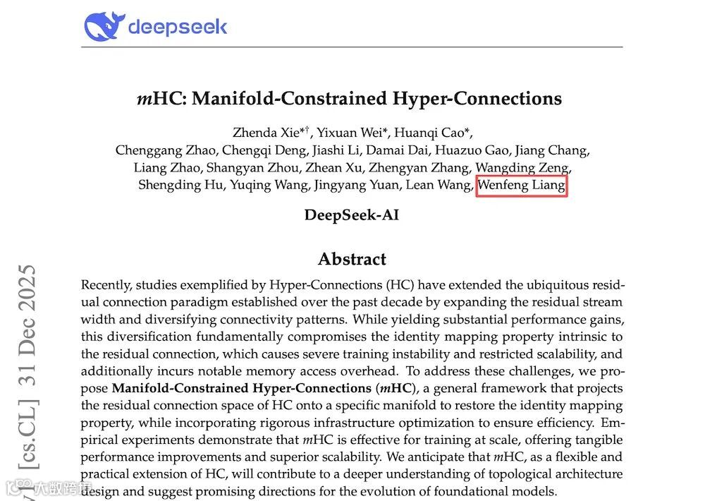 智东西1月1日报道,DeepSeek团队于昨日晚间发布新论文《Manifold-Constrained Hyper-Connections》,提出一种新型残差连接方案——mHC(Manifold-Constrained Hyper-Connections),可显著提升大模型训练稳定性与可扩展性。