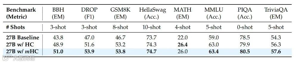 下游任务表现方面,27B模型在BBH(51.0 vs HC 48.9)、DROP(53.9 vs 51.6)、GSM8K、MATH、MMLU等任务上全面优于HC与基线,最高提升达2.3个百分点,验证其在复杂推理与语义建模中的优势 [10] 。