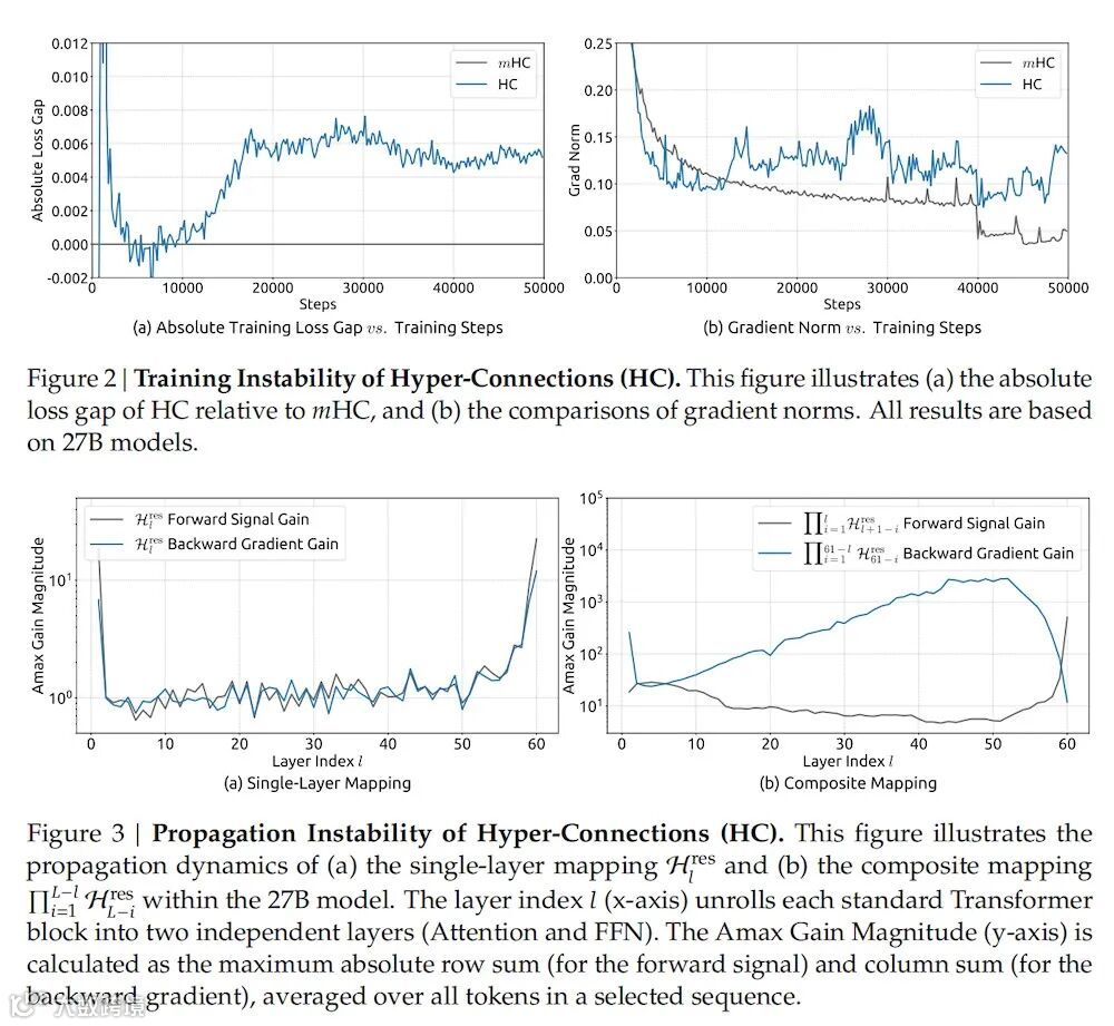 ▲在27B模型中,HC的多层残差映射在反向传播中导致信号最大放大倍数逼近3000,存在梯度爆炸风险。
