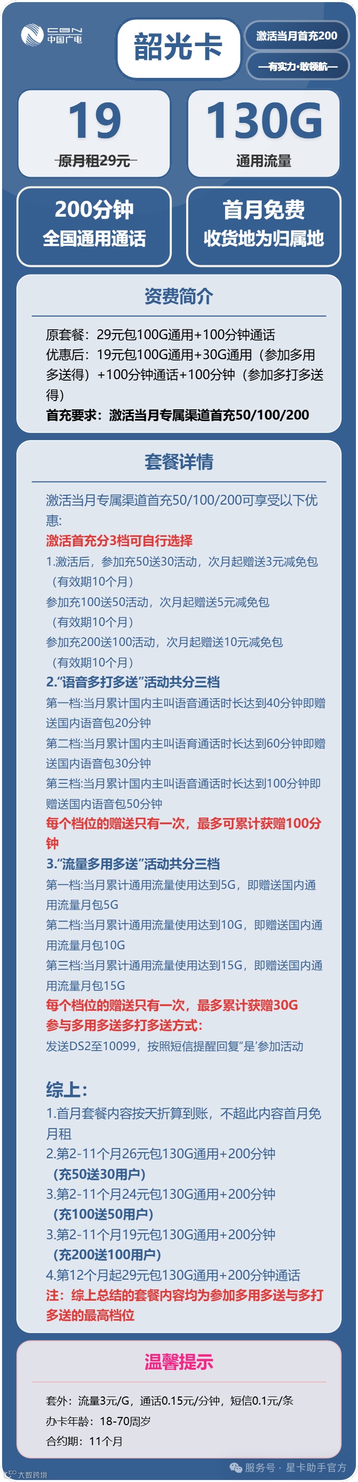 - 流量:130G通用流量 + 200分钟通话