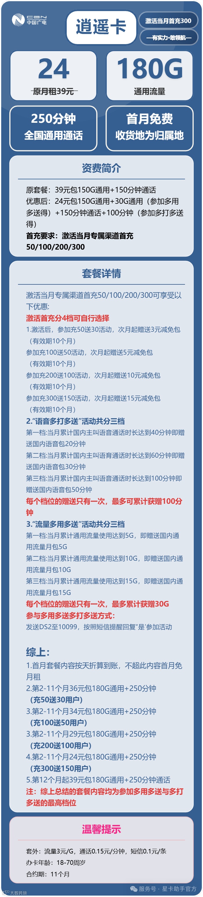 - 流量:180G通用流量 + 250分钟通话