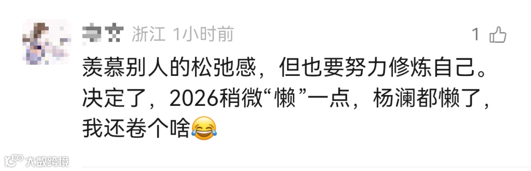 所谓“退休声明”,并非退出事业,而是主动松开长期紧绷的生活之弦;偷懒不是懈怠,而是将省下的时间投入真正热爱之事。这种“人设反转”消解了公众人物的距离感,“杨懒”的诞生让“惬意”从抽象理想变为可感知、可效仿的日常选择 [3] 。