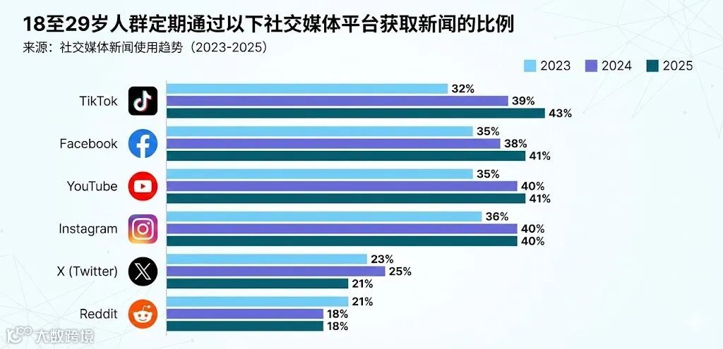 根据皮尤研究中心的新数据,2025年有43%的18至29岁人群表示他们经常从 TikTok 获取新闻,而 YouTube 和 Facebook 均为41%,Instagram 为40%。这款视频应用在过去几年里一路狂飙。2023年只有32%的人将其视为常规新闻来源。