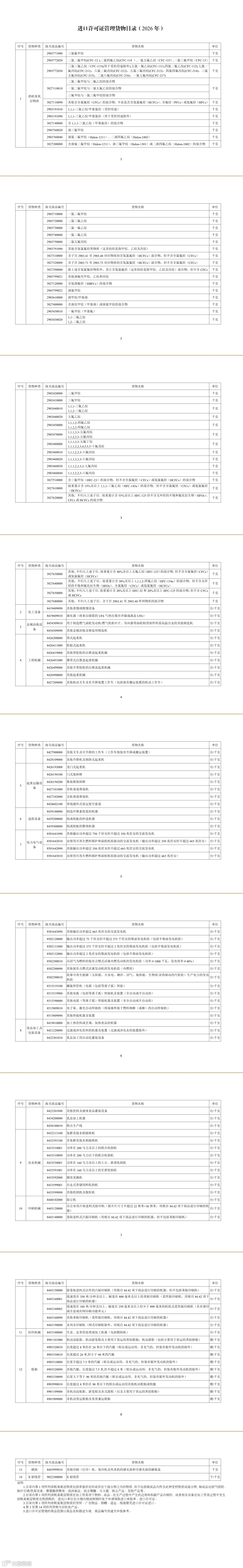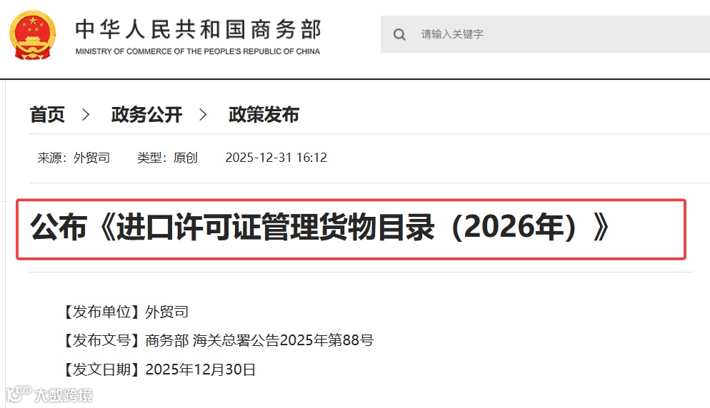 依据《中华人民共和国对外贸易法》《中华人民共和国货物进出口管理条例》《消耗臭氧层物质管理条例》《货物进口许可证管理办法》《消耗臭氧层物质进出口管理办法》《机电产品进口管理办法》《重点旧机电产品进口管理办法》等法律、行政法规和规章,现公布《进口许可证管理货物目录(2026年)》,自2026年1月1日起执行。