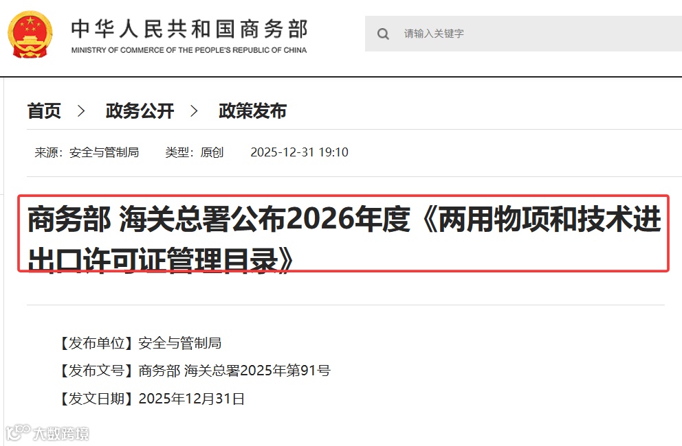 商务部 海关总署公布2026年度《两用物项和技术进出口许可证管理目录》