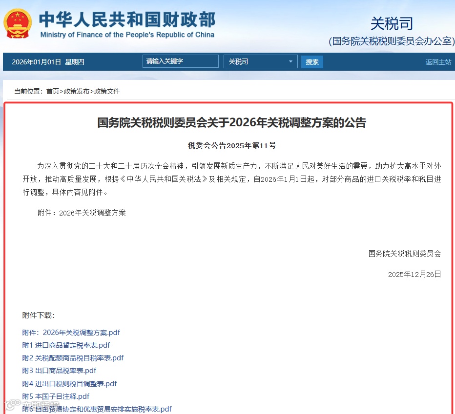 2026年的关税调整方案体现出对国内发展需求与全球经济责任的统筹考量。根据方案,自2026年1月1日起,我国将对部分商品的进口关税税率和税目进行系统调整。(详参:https://gss.mof.gov.cn/gzdt/zhengcefabu/202512/t20251229_3980625.htm#/)