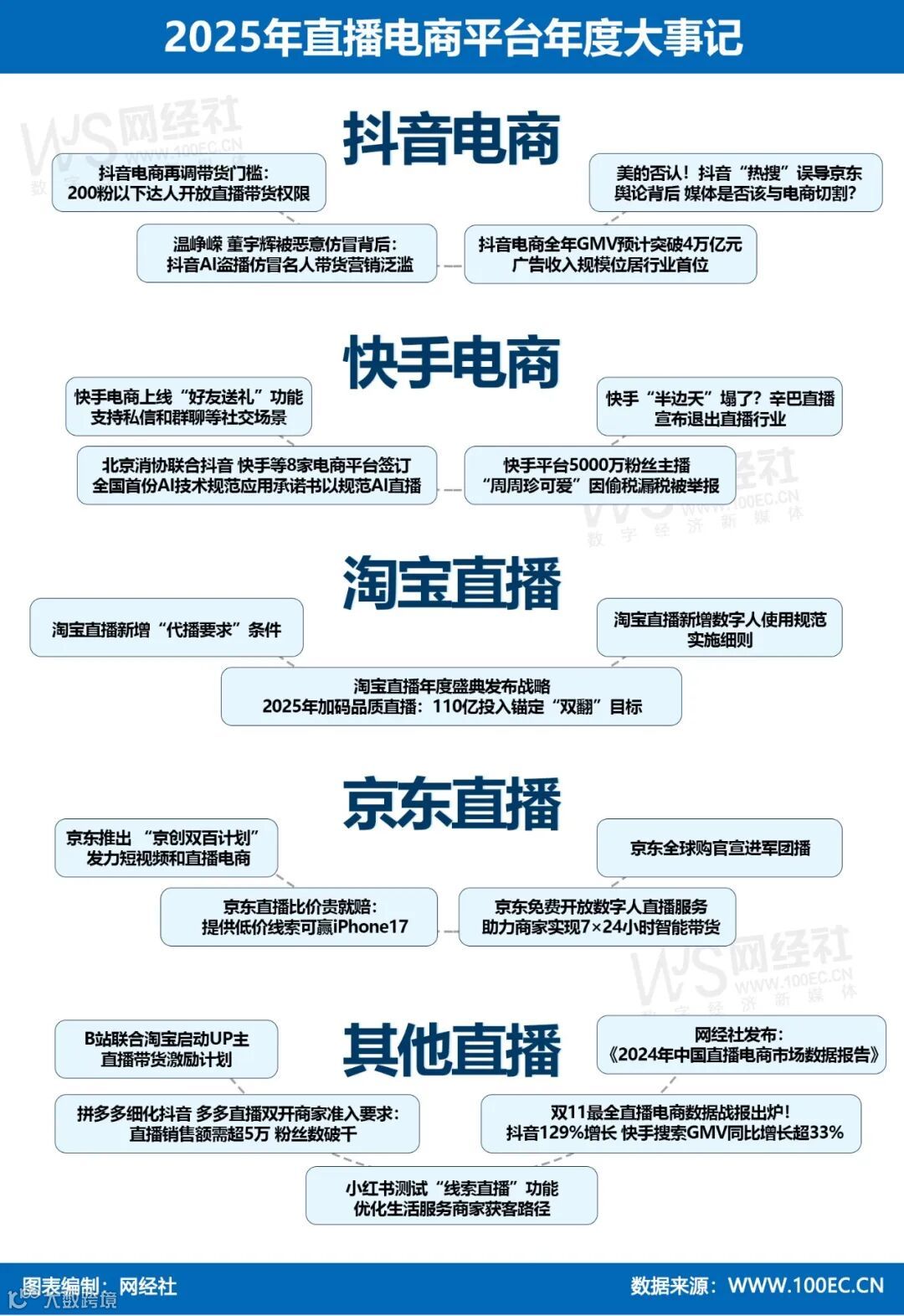 导读:2025年,抖音凭借巨大规模效应与行业影响力,持续调整规则并应对AI盗播等新挑战;快手面对头部主播震荡,强化合规与社交功能;淘宝直播与京东则分别锚定“品质”与“低价+技术开放”战略,寻求差异化竞争。同时,跨平台合作、AI治理规范成为行业新焦点,显示市场在高速扩张中正走向更规范、融合与多元的发展阶段。