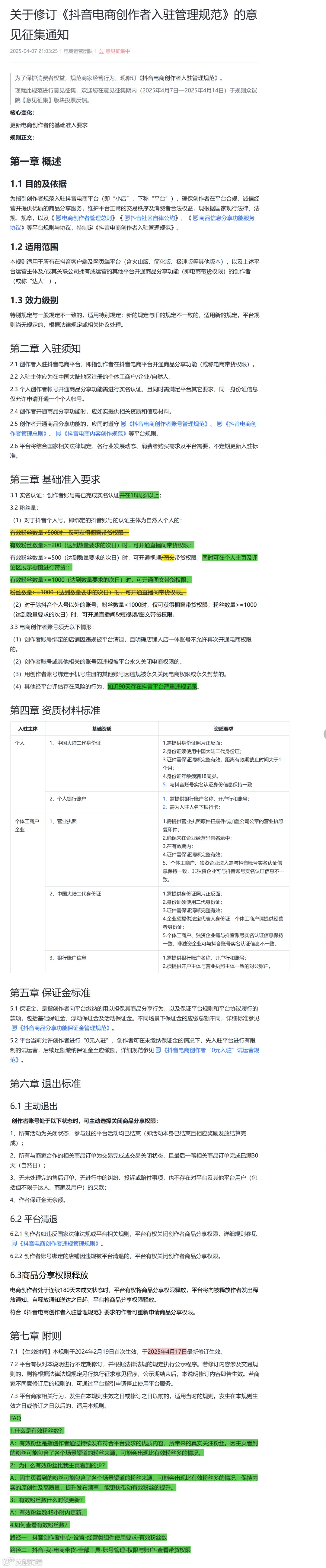 4月7日,抖音电商发布《关于修订〈抖音电商创作者入驻管理规范〉的意见征集通知》,对电商创作者的带货权限规则进行重大调整,首次将个人与非个人账号的带货权限与粉丝量分级挂钩。