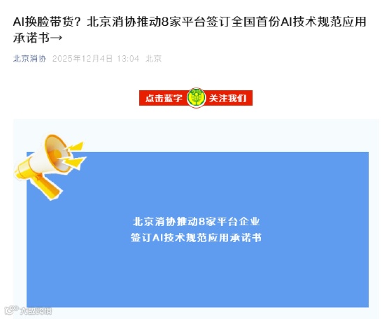 事件三:北京消协联合抖音 快手等8家电商平台签订全国首份AI技术规范应用承诺书以规范AI直播