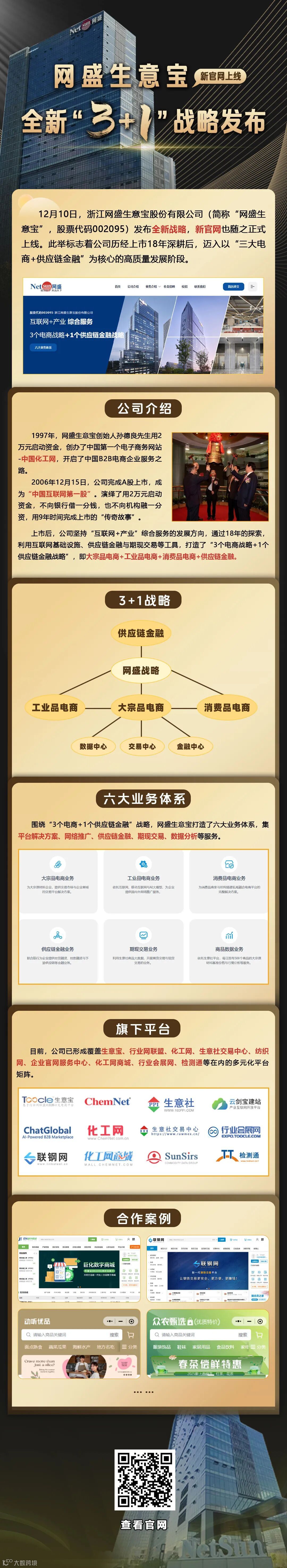 12月10日,网盛生意宝(002095)发布“3+1”全新战略,并同步上线了承载新战略全景的官方网站(www.netsun.com)。此举标志着公司历经上市18年深耕后,迈入以“三大电商+供应链金融”为核心的高质量发展阶段。