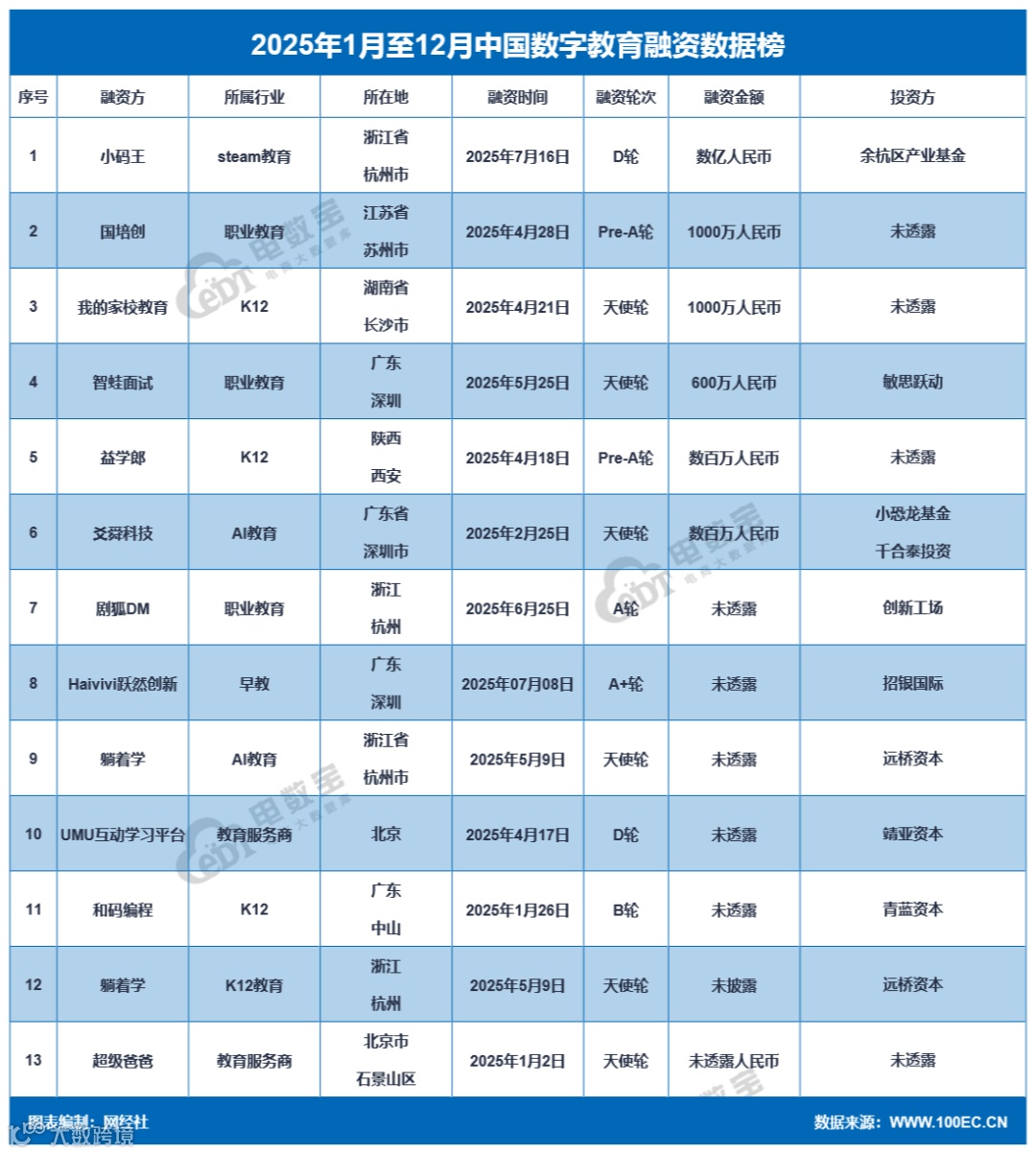 据网经社旗下大数据库“电数宝”(DATA.100EC.CN)监测数据显示,2025年数字教育领域融资事件数共13起,已透露的融资总金额达数亿元人民币。融资方包括:Haivivi跃然创新、小码王、剧狐DM、智蛙面试、躺着学、国培创、我的家校教育、益学郎、UMU互动学习平台、爻舜科技、和码编程、超级爸爸等。