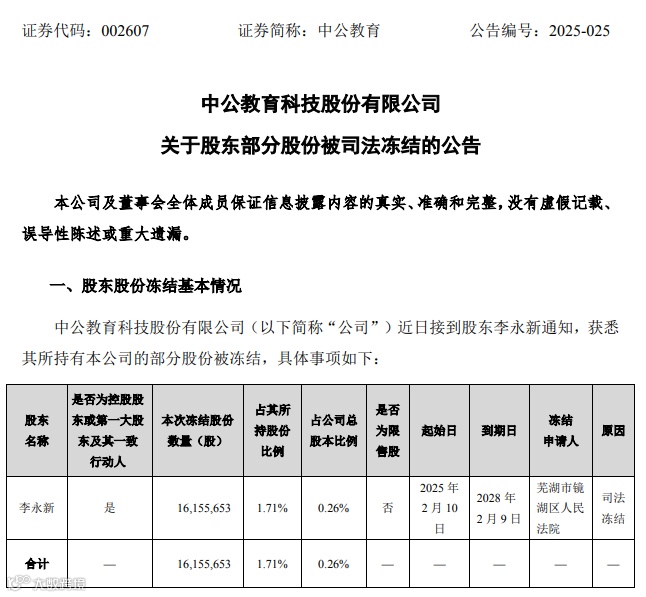 2月12日,中公教育(002607)发布公告,股东李永新持有的1615.57万股被芜湖市镜湖区人民法院司法冻结,占其所持股份比例1.71%,占公司总股本比例0.26%。