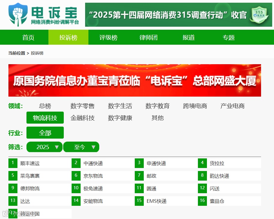 据国内知名网络消费纠纷调解平台网经社“电诉宝”(315.100EC.CN)2025年至今受理的中国物流科技领域用户有效投诉显示,入选投诉榜的依次为:顺丰速运、中通快递、申通快递、货拉拉、菜鸟裹裹、京东物流、邮政、韵达快递、德邦物流、极兔速递、圆通、闪送、达达、安能物流、EMS快递、壹品仓、转运中国。