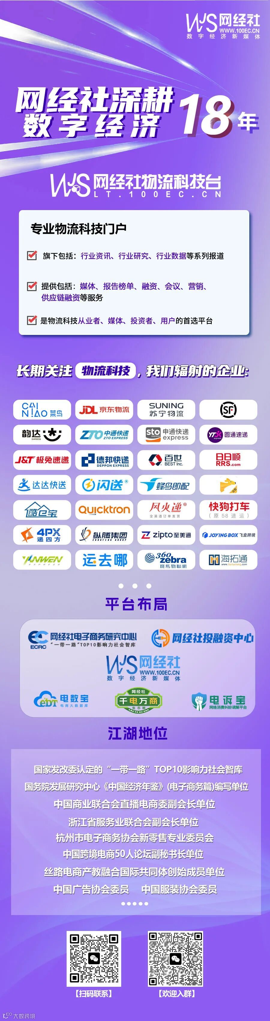 网经社深耕数字经济行业18年,长期关注物流科技,我们辐射的企业有:菜鸟、京东物流、苏宁物流、顺丰、韵达、中通快递、申通快递、圆通速递、极兔速递、德邦快递、百世、日日顺、达达快送、闪送、蜂鸟即配、酷仓宝、风火递、快狗打车、纵腾集团、至美通、飞盒跨境、递四方、运去哪、海拓通。