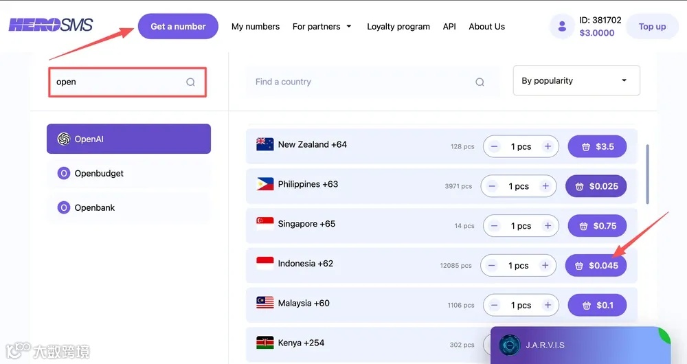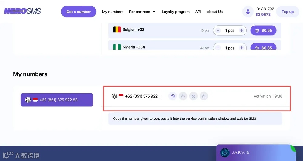 第四步,购买号码。充值完成后,登录到 Hero-SMS 后台点击「Get a number」购买号码,您可以根据自己的实际需求选择对应的网站和软件,然后选择好国家地区的手机号和数量,点击后面的「购物车」图标下单就可以了,这里仍然以 ChatGPT 为例,购买成功之后会自动扣费并且在当前页面底部显示状态。