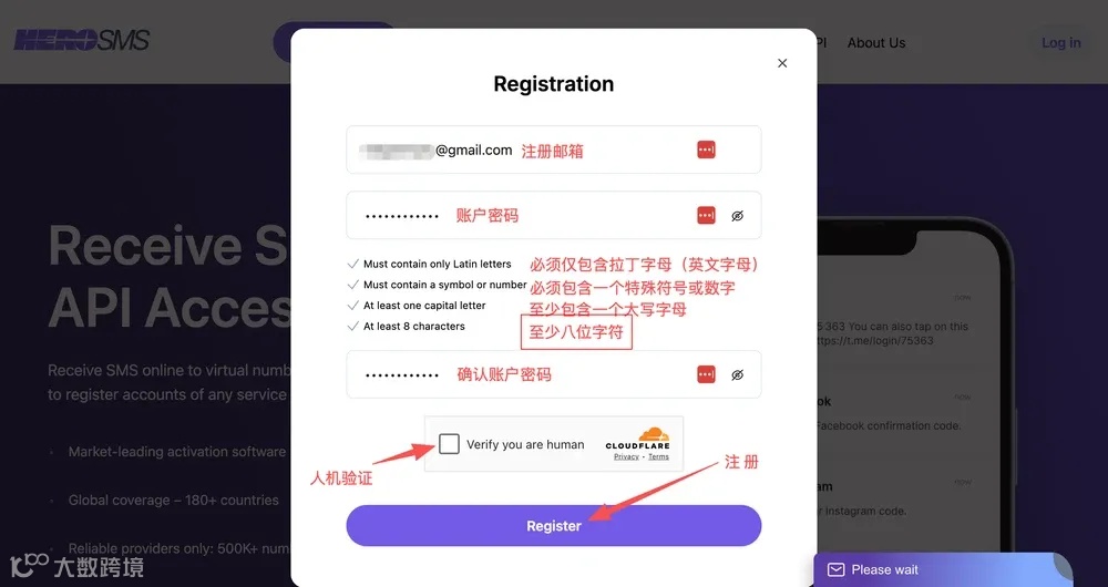 第一步,访问 Hero-SMS 官方网站,点击网站右上角的「Log In」按钮,如果您已经注册了账户,可以直接输入账号密码完成人机验证后登录。如果您未注册账户,可以点击登录弹窗底部的「Register」按钮注册账户,依次输入您的注册邮箱和密码,密码必须符合要求才可以,一切准备好之后点击底部的「Register」按钮完成注册。