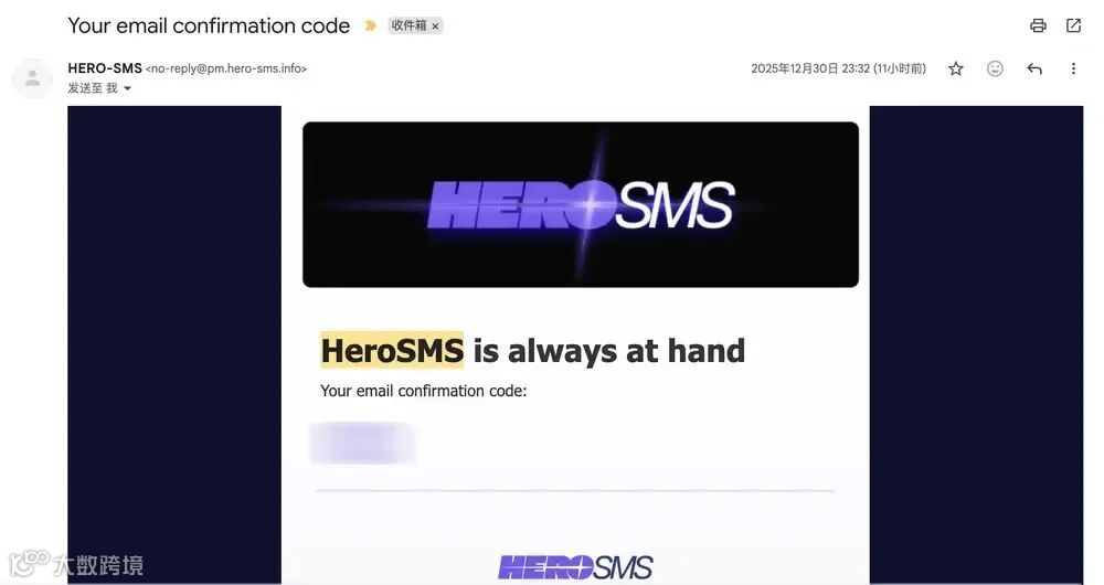 第二步,注册成功之后,您的注册邮箱会收到一封来自 Hero-SMS 官方的邮件,邮件中包含您注册邮箱的确认码,这可能涉及到后期您账户的安全性问题,请注意保管,这时您的账户就注册成功了。