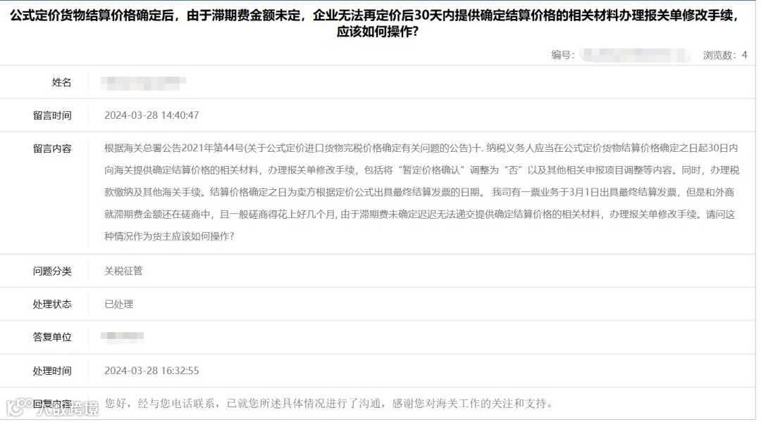 企业在总署网站上的提问的问题具有普遍性,但是各直属海关回复的质量参差不齐,或者不予直接正面回复,通过电话沟通。