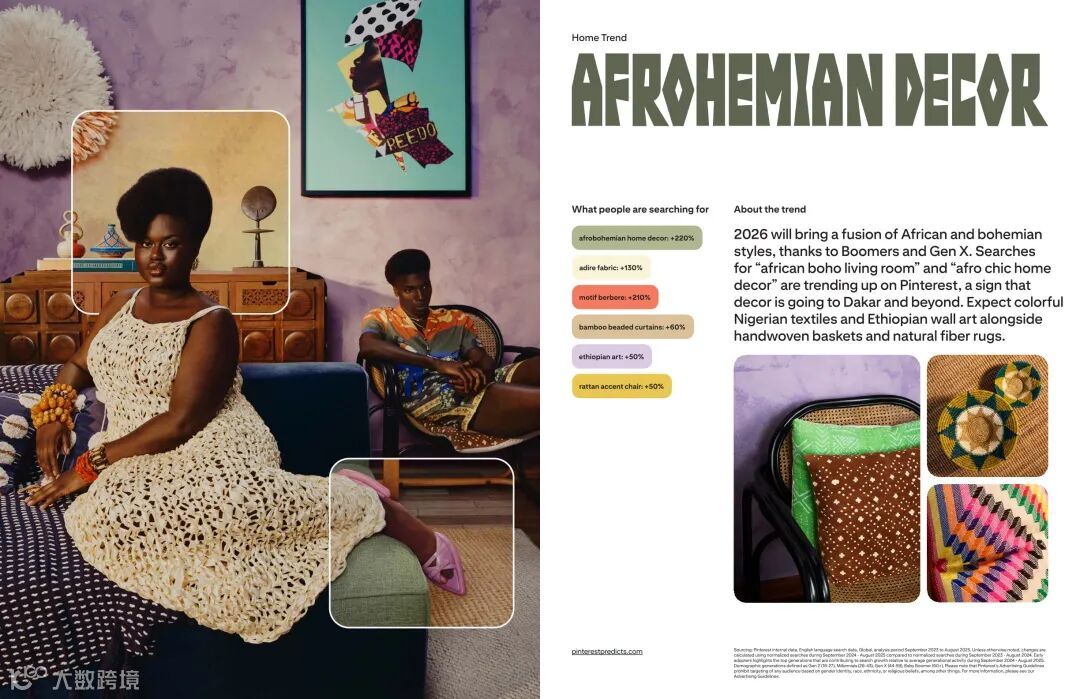 Boomers 与 Gen X 正在推动一种融合非洲文化与波西米亚的家居风格:尼日利亚织物、埃塞俄比亚艺术、手工藤编。