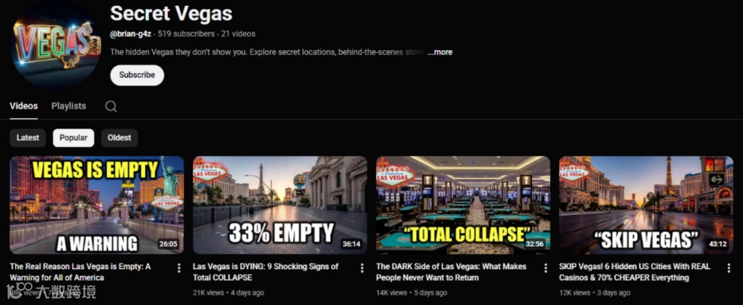 该领域几乎未饱和,对新手极为友好。内容聚焦拉斯维加斯的隐秘故事、冷知识与历史碎片,视频时长多为30–40分钟,制作方式简单: