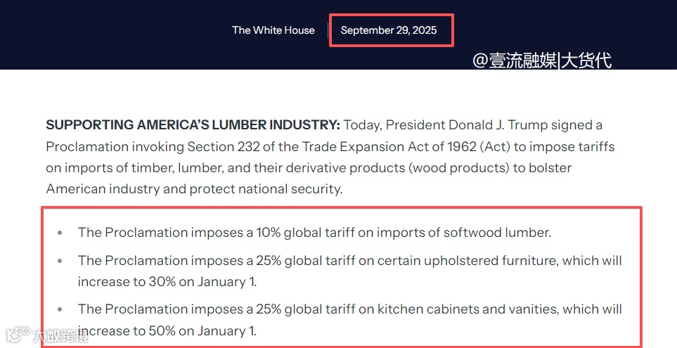 - 厨房橱柜与梳妆台:当前25%,原定2026年1月1日起升至50%;