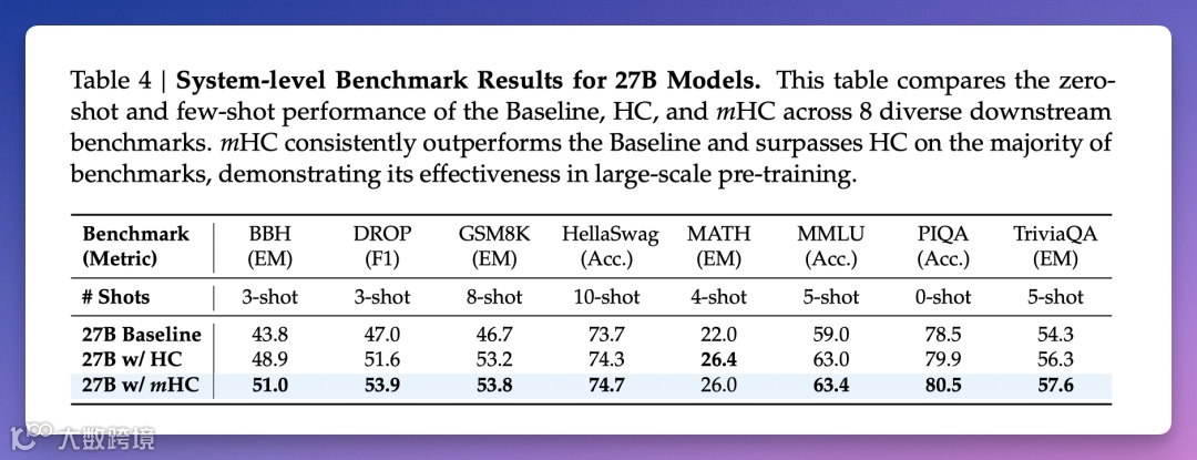 在 270 亿参数 MoE 架构(基于 DeepSeek-V3)测试中,mHC 在 BBH 推理(43.8 → 51.0)、DROP 阅读理解(47.0 → 53.9)等 8 项任务上全面超越原版超连接,并多数指标领先豆包方案。DeepSeek 实验表明:“模型越大,mHC 的优势越明显”。