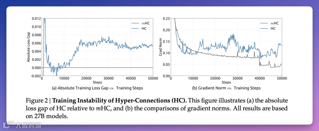 DeepSeek 在 270 亿参数模型训练中发现,原版超连接因引入可学习混合矩阵,在深层堆叠后导致信号放大近 3000 倍,引发训练损失骤升、训练崩溃。为解决该问题,mHC 对混合矩阵施加「双随机约束」——要求每行每列之和均为 1,确保信号经任意层数传递后不会被放大或衰减。