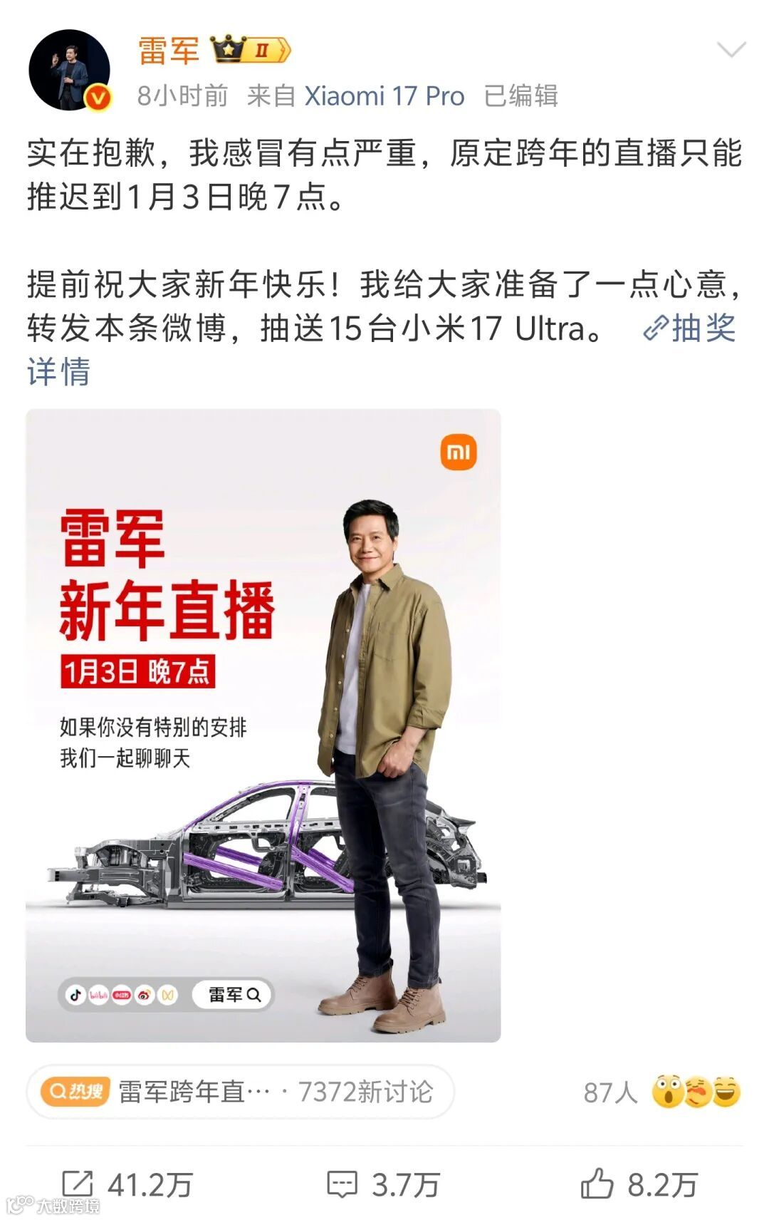 “实在抱歉,我感冒有点严重,原定跨年的直播只能推迟到1月3日晚7点。”雷军因重感冒取消当晚跨年拆车直播,并在微博公开致歉。评论区以“保重身体”为主流声音,与半年前的舆论风暴形成鲜明对比。